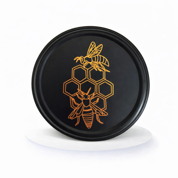 Zakrętka do słoików z motywem pszczół na małym plastrze miodu, w kolorze czarnego matu ze złotym zdobieniem.