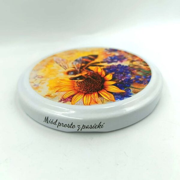 Zakrętka słoika „Miód prosto z Pasieki” z kolorową grafiką pszczoły na kwiecie M-36, idealna dla domowych i rzemieślniczych miodów.